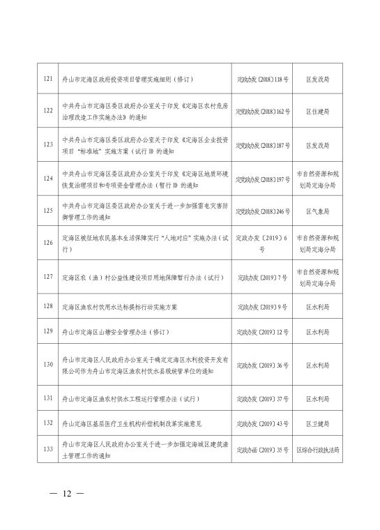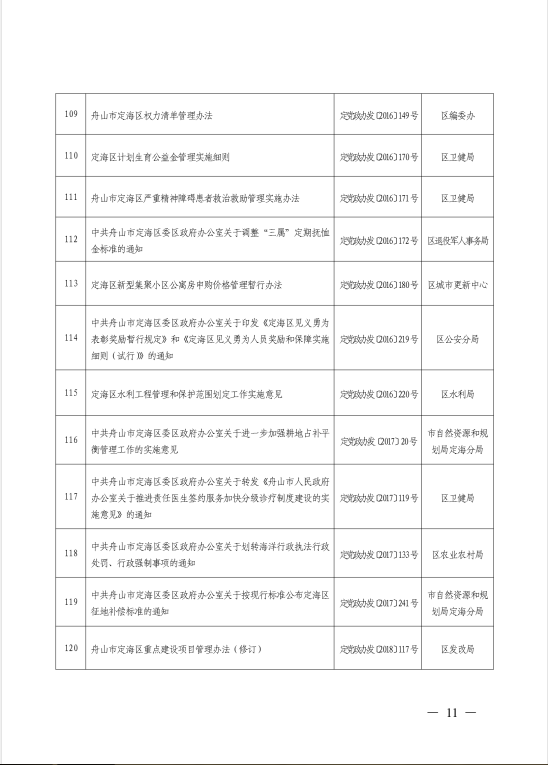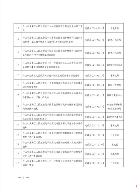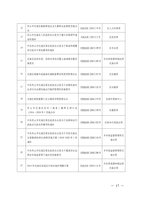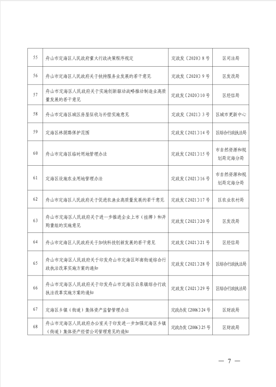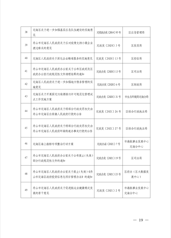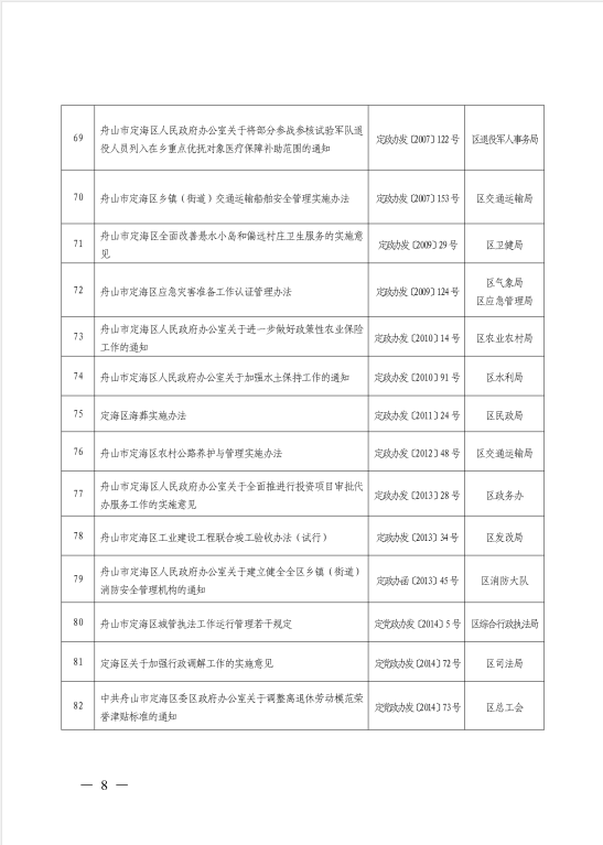 | 舟山市定海區人民政府辦公室關于公布區政府及區政府辦公室行政規范性文件清理結果的通知 | ||