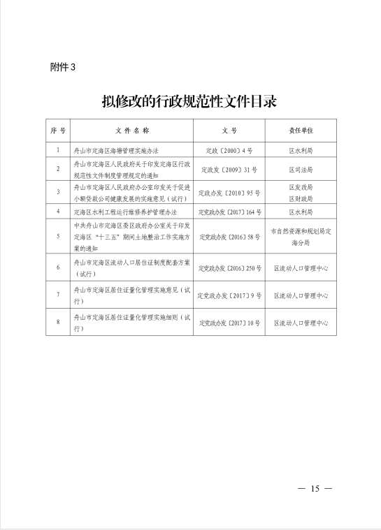 各鎮人民政府、街道辦事處,區屬各單位: 根據《浙江省行政規范性文件管理辦法》(省政府令第372號)的規定,區政府組織相關部門對2021年12月31日以前區政府和區政府辦公室(原區委區府辦)制發的行政規范性文件(以下簡稱區政府行政規范性文件)進行了全面清理。經區政府第12次常務會議審議通過,繼續有效的行政規范性文件146件;繼續有效但有關限額標準執行現行上位法的規定或暫停執行相關內容與上位法不一致的行政規范性文件3件;修改的行政規范性文件8件暫時有效;廢止(失效)的行政規范性文件49件。經區政府同意,現將上述清理結果予以公布。廢止(失效)的49件行政規范性文件中,在本次清理結果公布前已被新出臺的行政規范性文件廢止的或文件執行時效已經終止的,按原時效執行。 除上述繼續有效和暫時有效的文件,以及區委、區政府聯合制定的行政規范性文件外,2021年12月31日前以區政府和區政府辦公室(原區委區府辦)名義發布的其他行政規范性文件一律不得再作為直接實施行政管理的依據。需修改的8件行政規范性文件中與法律、法規和規章等上位法相抵觸部分的內容停止執行,需修改的行政規范性文件一年內修改完畢重新發布,新文件發布后原文件自行廢止。 因機構改革部門職能調整,繼續有效和暫時有效的文件中涉及工作任務調整的,按照機構改革方案和部門“三定”方案確定的職能負責實施。本通知自公布之日起施行。 附件:1.繼續有效行政規范性文件目錄 2.繼續有效但有關限額標準執行現行上位法的規定或暫停執行相關內容與上位法不一致的行政規范性文件目錄 3.擬修改的行政規范性文件目錄 4.廢止(失效)的行政規范性文件目錄 舟山市定海區人民政府辦公室 2023年1月29日 (此件公開發布)