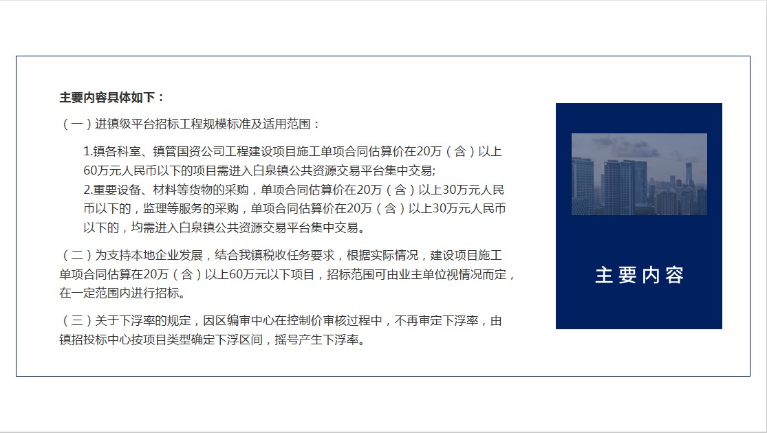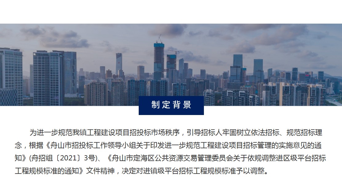 | (圖解)《舟山市定海區(qū)白泉鎮(zhèn)人民政府關(guān)于依規(guī)調(diào)整進(jìn)鎮(zhèn)級平臺(tái)招標(biāo)工程規(guī)模標(biāo)準(zhǔn)及相關(guān)事項(xiàng)的通知》政策解讀 | ||