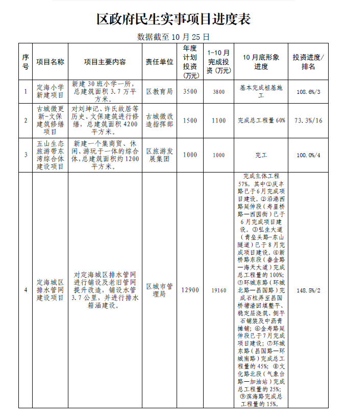 2024年定海區政府民生實事代表票決項目10月份情況表