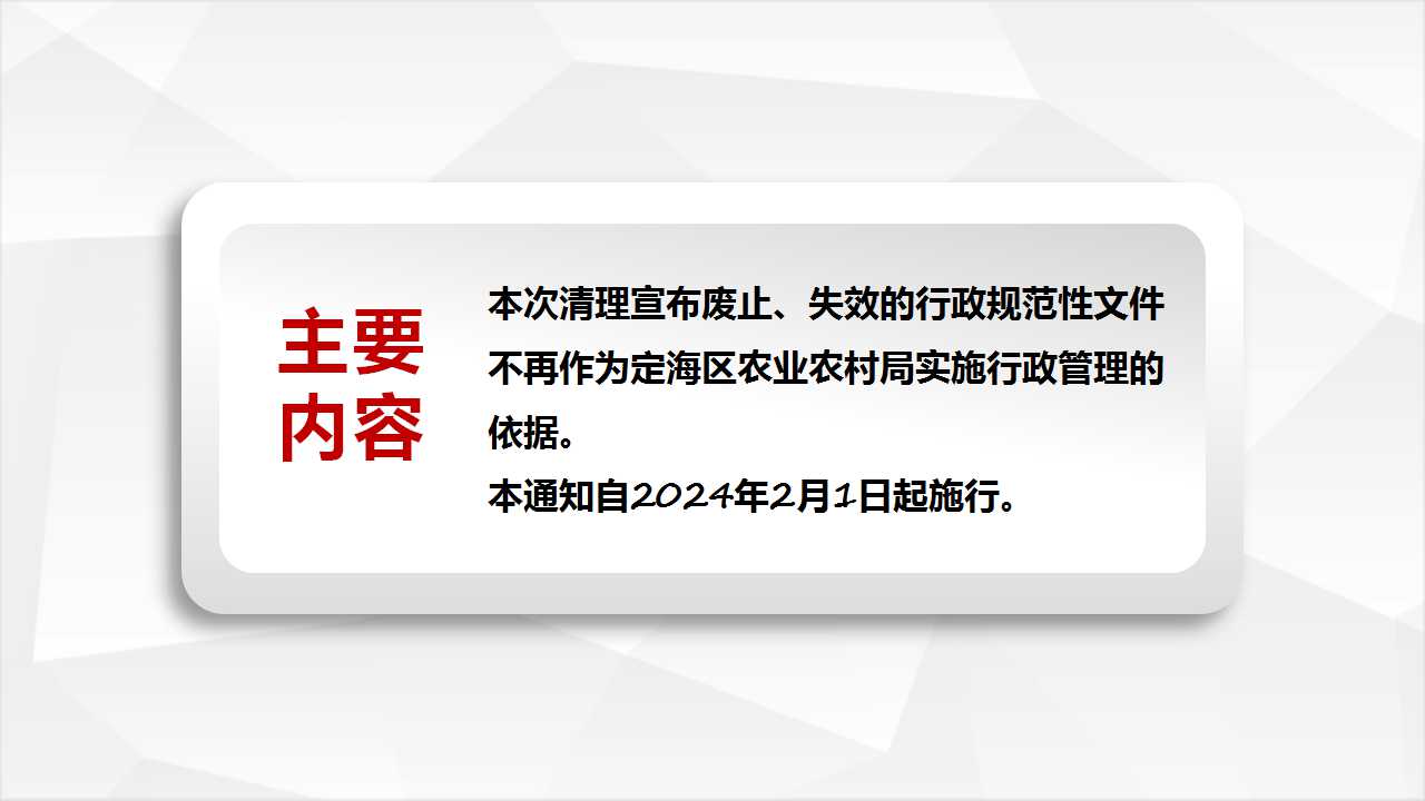 | (圖解)《舟山市定海區(qū)農(nóng)業(yè)農(nóng)村局關(guān)于公布行政規(guī)范性文件清理結(jié)果的通知》 | ||