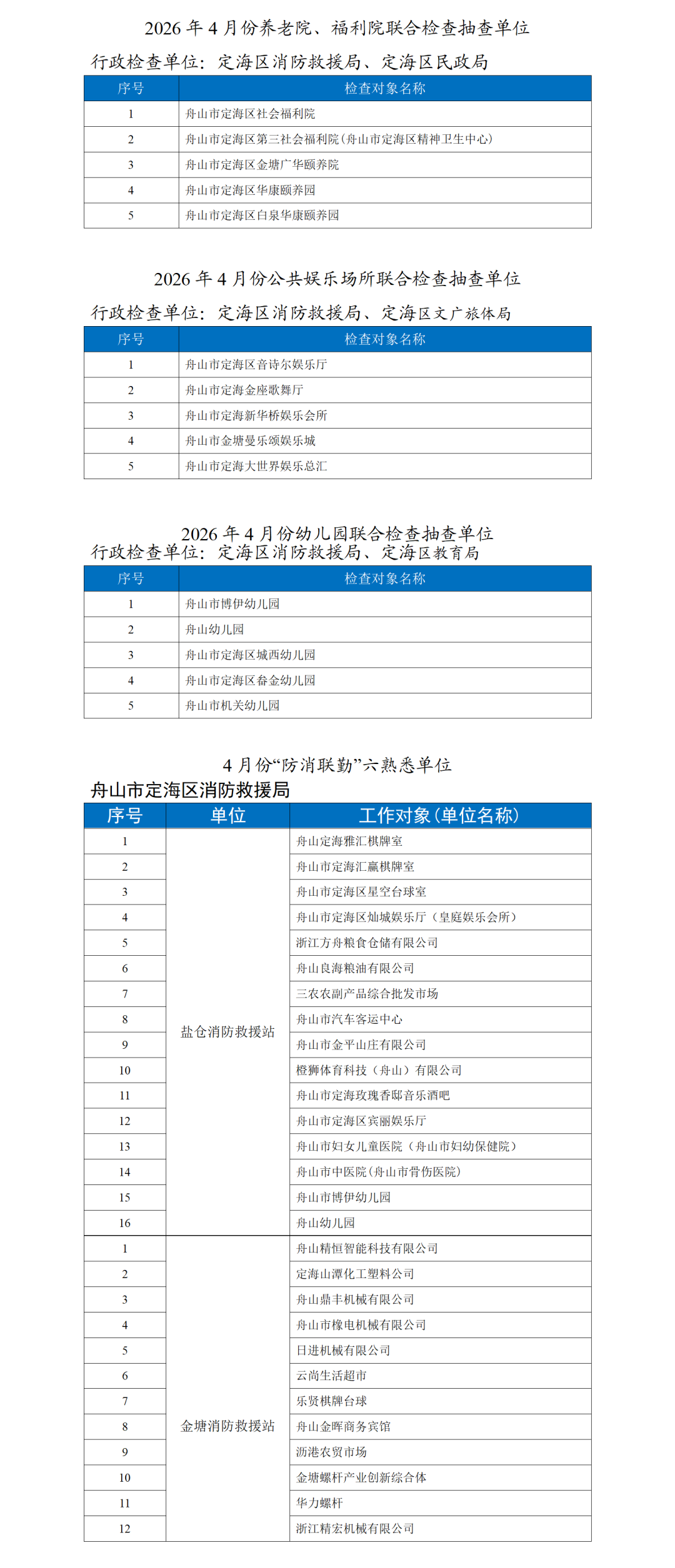 根據舟山市消防救援局2026年度行政檢查計劃,現公布4月份隨機抽取的被抽查對象花名冊。