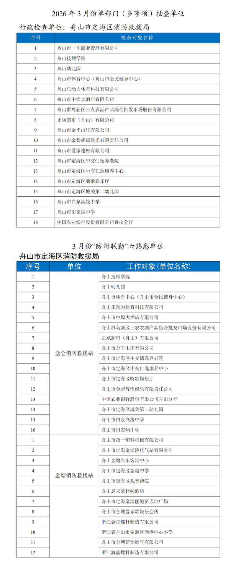 根據舟山市消防救援局2026年度行政檢查計劃,現公布3月份隨機抽取的被抽查對象花名冊。